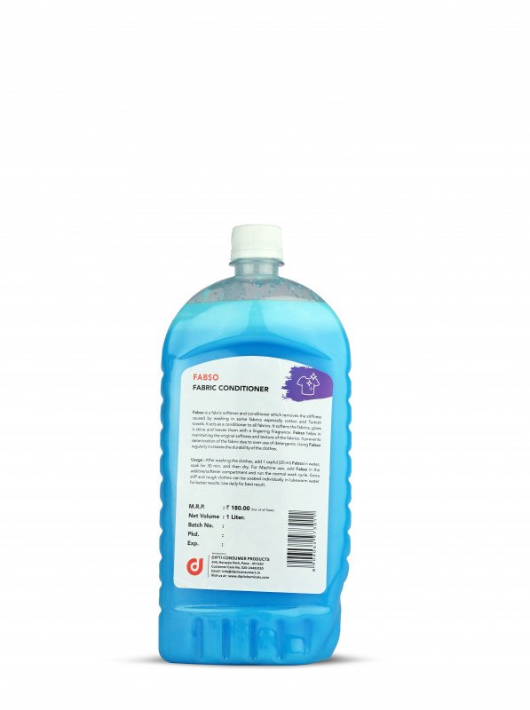 Fabso is a fabric softener and conditioner which removes the stiffness caused by washing in some fabrics especially cotton and Turkish towels. It acts as a conditioner to all fabrics. It softens the fabrics, gives it shine and leaves them with a lingering Fragrance. Fabso helps in maintaining the original softness and texture of the fabrics. It prevents deterioration of the fabric due to over use of detergents. Using Fabso regularly increases the durability of the clothes.