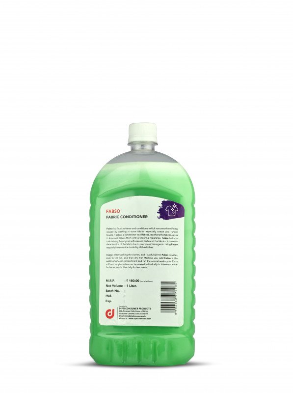 Fabso is a fabric softener and conditioner which removes the stiffness caused by washing in some fabrics especially cotton and Turkish towels. It acts as a conditioner to all fabrics. It softens the fabrics, gives it shine and leaves them with a lingering Fragrance. Fabso helps in maintaining the original softness and texture of the fabrics. It prevents deterioration of the fabric due to over use of detergents. Using Fabso regularly increases the durability of the clothes.